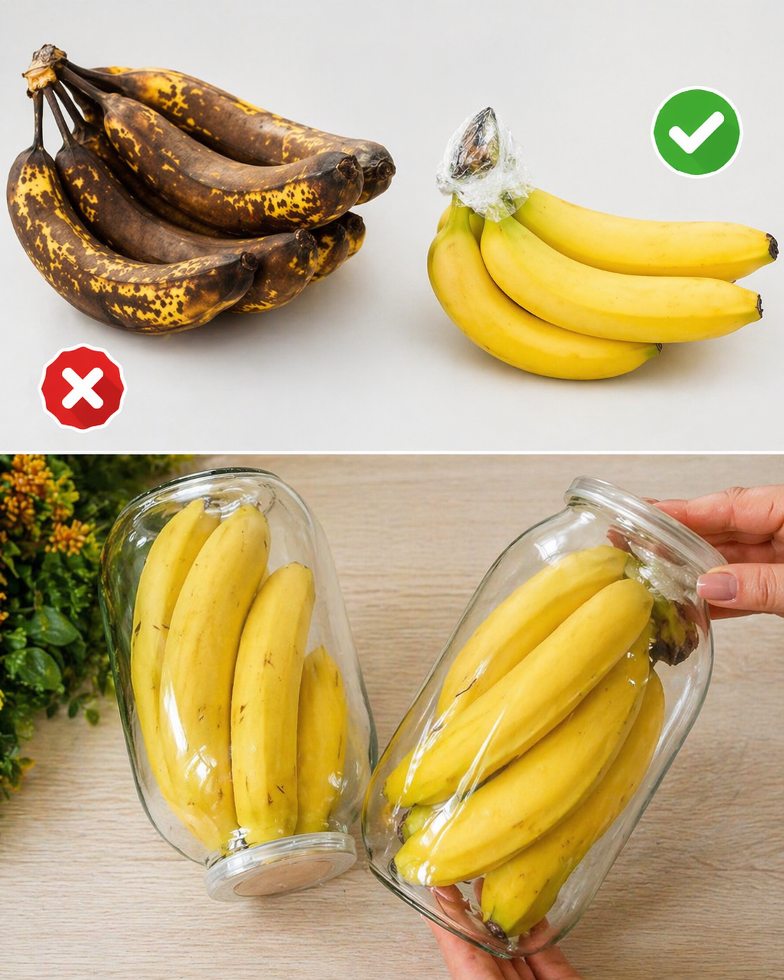 Плодоножки бананов выделяют этилен — газ, который ускоряет созревание. Если плотно обернуть верхушку связки пищевой плёнкой, можно частично задержать этот газ и тем самым замедлить процесс. Для лучшего эффекта оборачивайте плодоножки сразу после покупки.