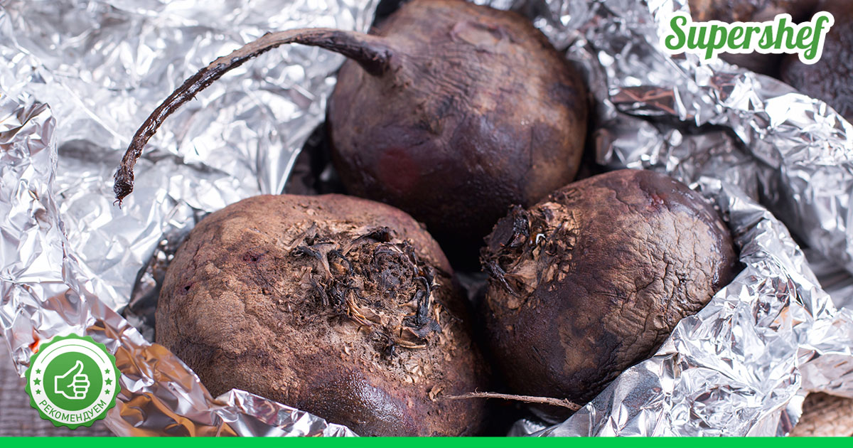 Для приготовления этого салата мы будем использовать запеченную в духовке свеклу. Прежде, чем ее запекать, тщательно вымойте корнеплод и замотайте его в фольгу. Разогрейте духовку до 180 градусов и запекайте свеклу примерно час. Если у вас большие овощи, время запекания нужно увеличить. Проверить готовность свеклы вам поможет деревянная шпажка.