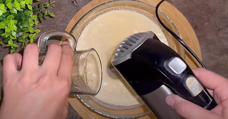 Яйца взбиваю с солью миксером, тонкой струйкой добавляю сахар. Затем ввожу ванилин, кефир и масло, снова работаю миксером.