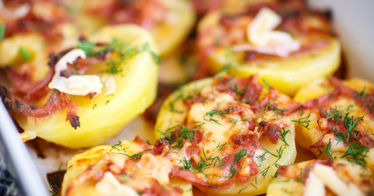- Заполняем полученной смесью каждую половинку картошки и выкладываем на заранее смазанную маслом форму для запеканки.