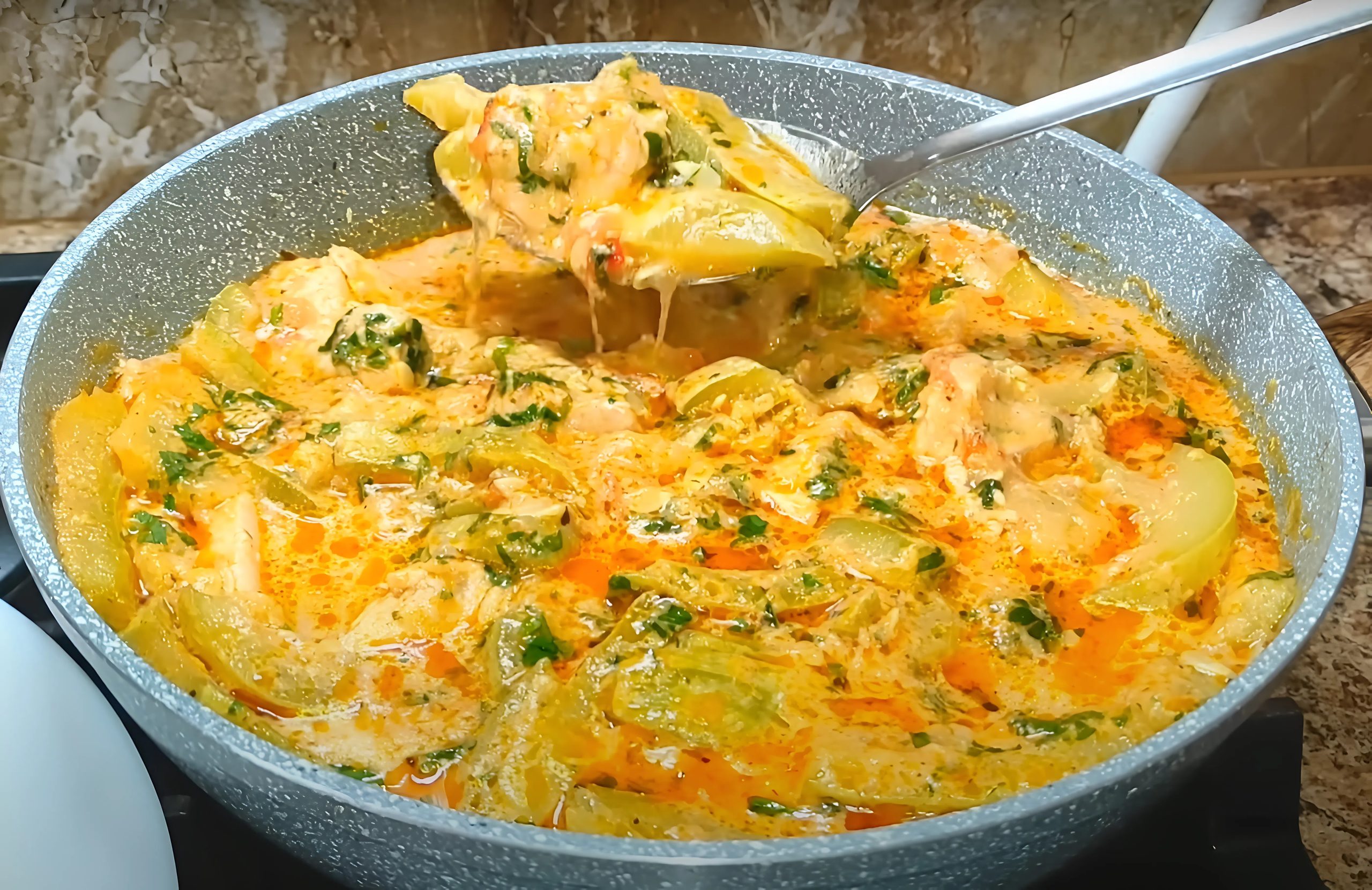 Тушеный кабачок, курица в сметанном соусе – великолепное блюдо обладающее хорошей сытностью