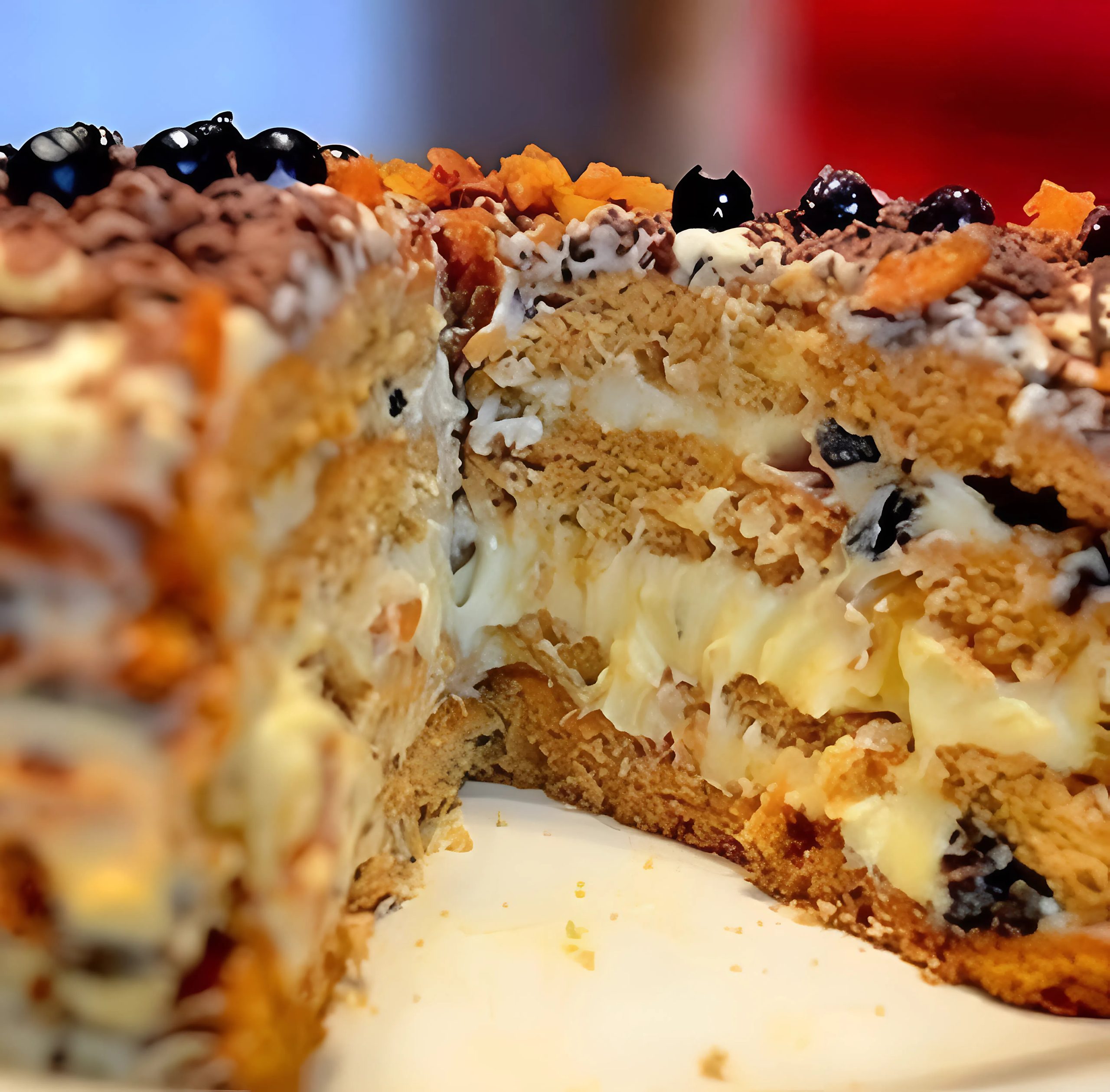 Продукты: Этапы: Крем: Готовый десерт собирают слоями, промазывая кремом. Украшение остаётся на