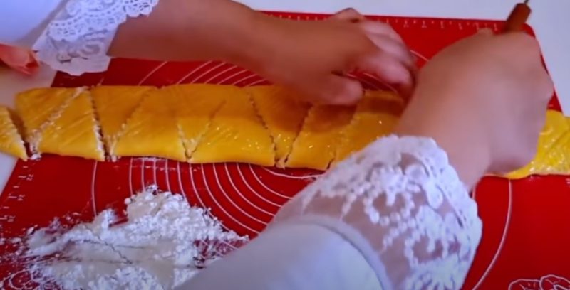 7. Смажьте поверхность взбитым желтком, при желании сделайте узоры ножом и нарежьте треугольниками или порционными кусочками.
