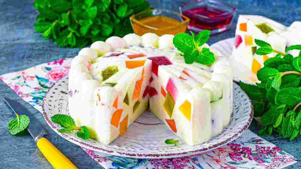 Сначала нужно развести желе разных цветов по инструкции на упаковке. Удобнее всего сделать это заранее — например, вечером, чтобы к утру оно полностью застыло. - Соединяем основу.