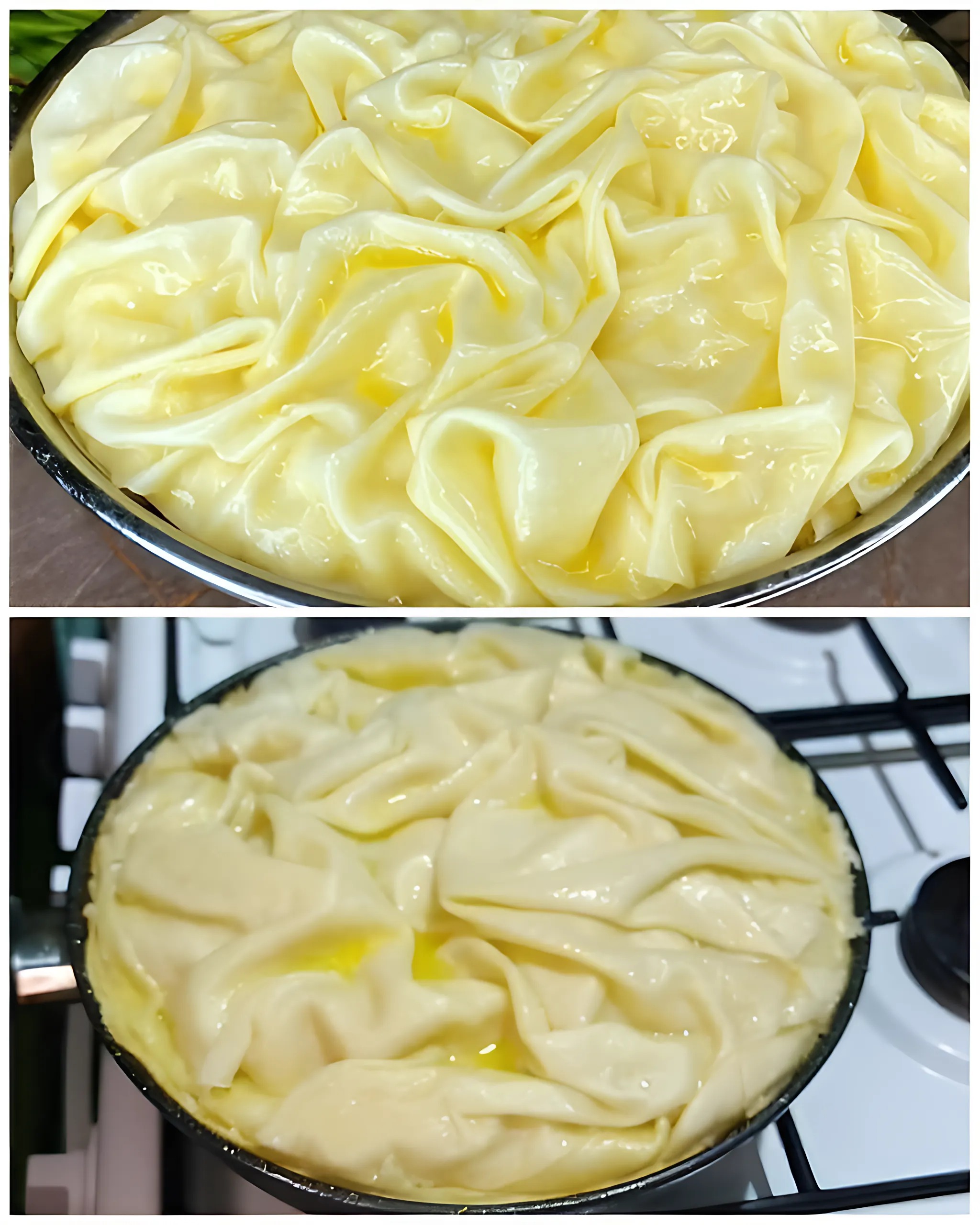 Каждый пласт нужно промазывать маслом и не забывать выкладывать начинку. Края последнего пласта нужно завернуть внутрь. Накрыть все крышкой, включить медленный огонь и готовить 20 минут.