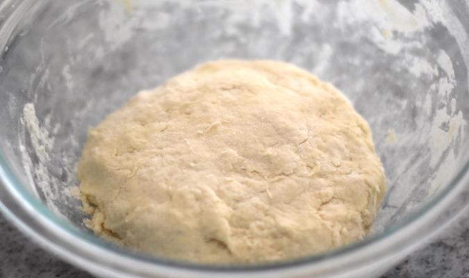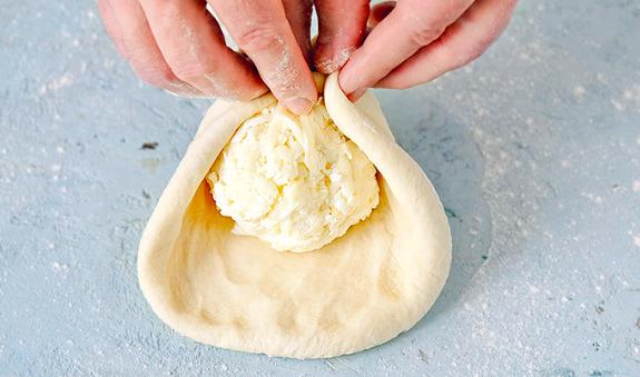 После замеса тесто накрывается и оставляется на отдых. Если оно все еще будет слишком жидким, можно добавить немного муки. Пока тесто отдыхает, готовится начинка: сыр натирается на крупной терке и смешивается с яйцом. Тесто делится на 9 частей, из которых формируются небольшие лепешки. В центр каждой кладется сырная начинка, а края собираются в мешочек, который аккуратно раскатывается, не давая начинке вывалиться.