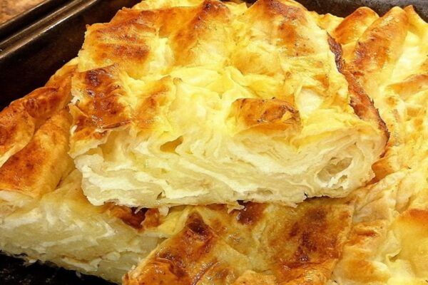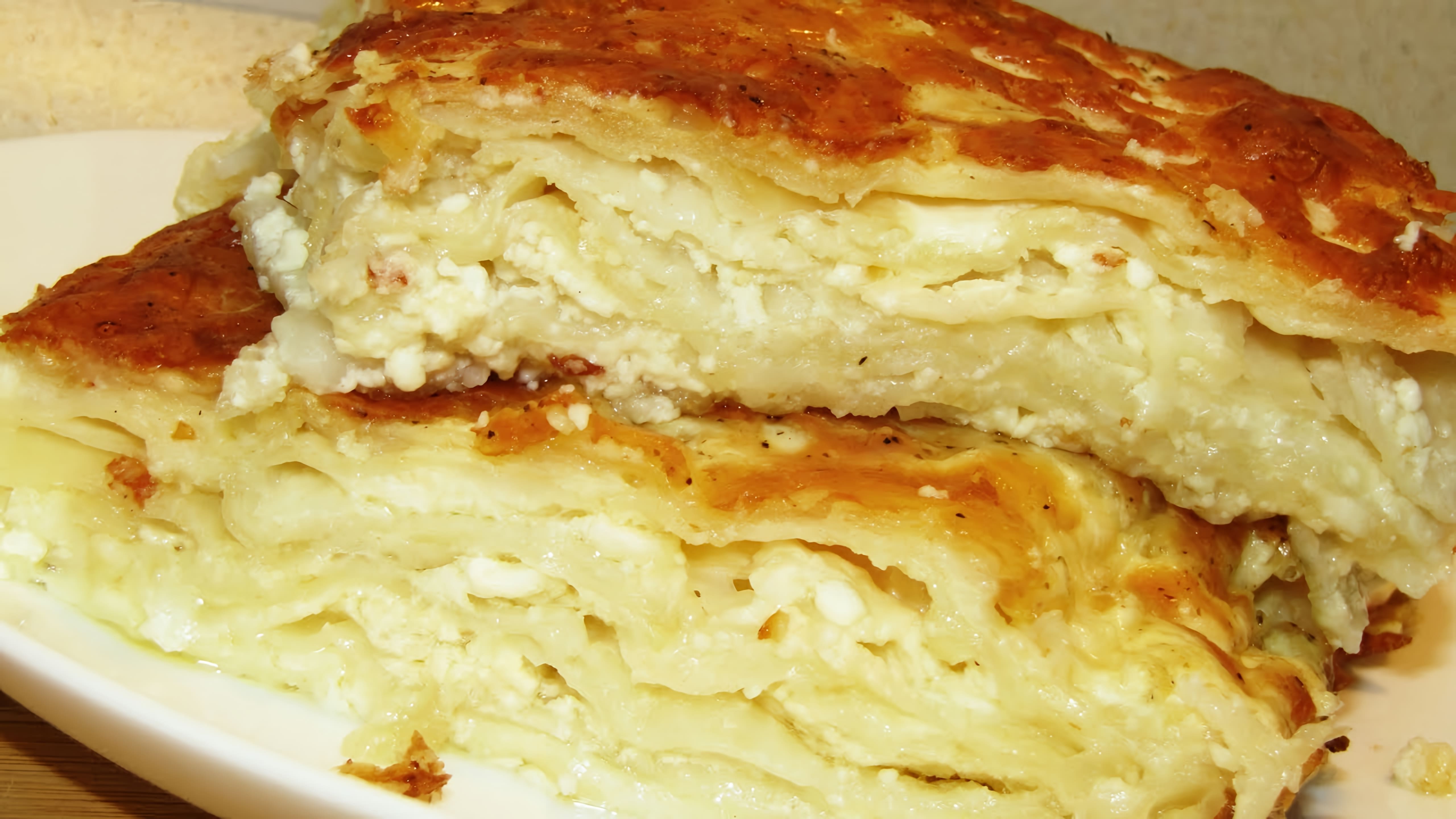 Между каждой складкой аккуратненько распределите творожно-кефирную заливку и добавьте небольшими кусочками сливочное масло. Отправьте форму в духовой шкаф, разогретый до 180 градусов, приблизительно на сорок минут.