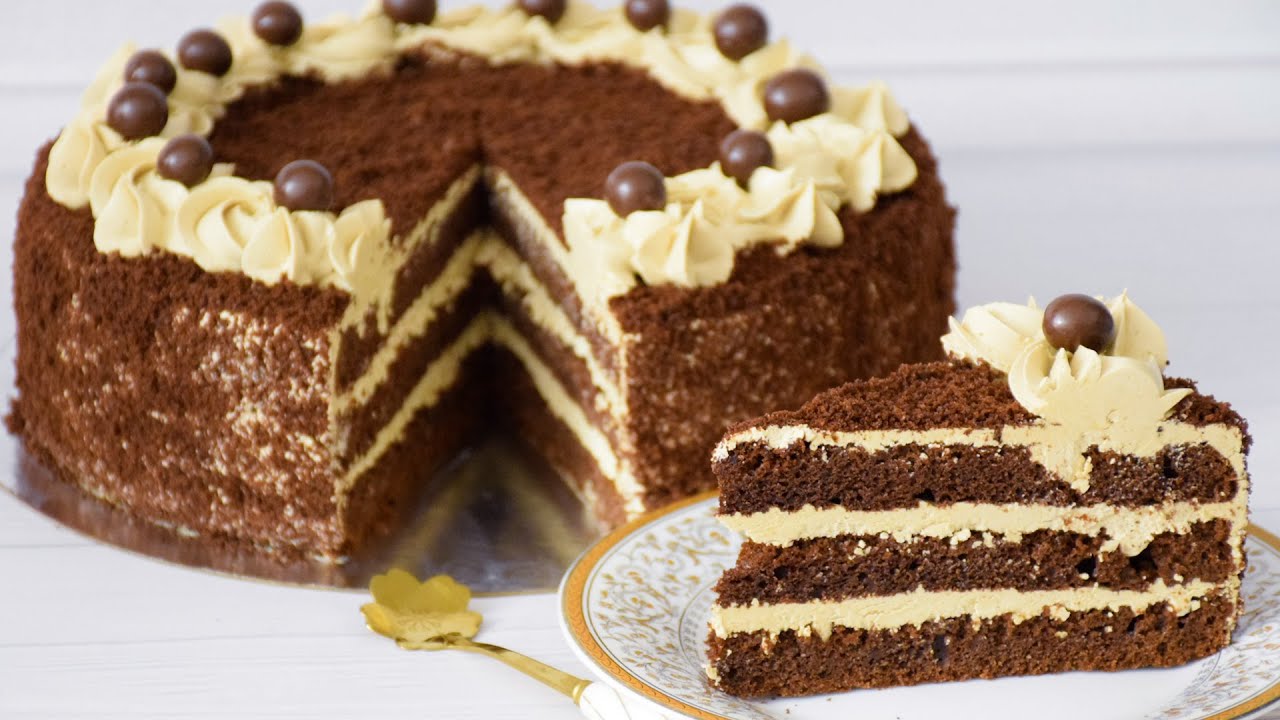 - После того как все слои выложены, поставьте торт в холодильник для пропитки. После охлаждения переверните форму и украсьте торт тертым шоколадом.