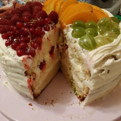 - Украсьте торт оставшимися фруктами и ягодами. Оставьте торт для пропитки в холодильнике.