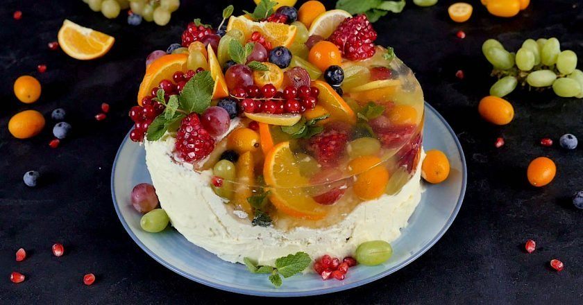 - Приготовьте желатин согласно инструкции. Фрукты очистите и нарежьте мелкими кусочками, оставив для украшения несколько фруктов. Ягоды промойте и обсушите.