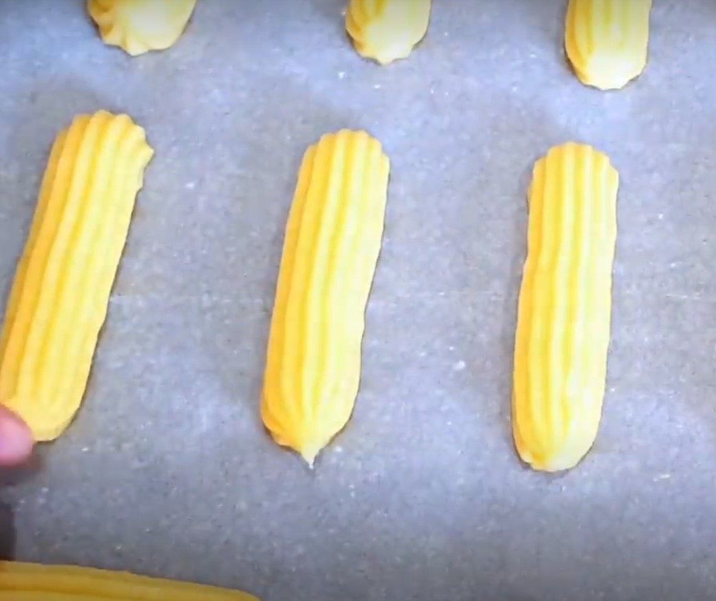 Далее следует остудить массу и по 1 вмешать яйца. Готовое тесто необходимо положить внутрь мешка для крема и отсадить заготовки на лист, застеленный пергаментной бумагой. Выпекайте при 150°C около сорок пять минут.