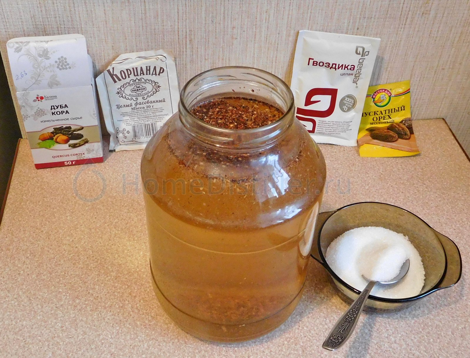 Дубовую кору заливают кипятком на 10 минут, затем воду сливают, а сырье подсушивают. Сахар растворяют в небольшом количестве водки, получая сироп. Все компоненты складывают в стеклянную банку, заливают оставшейся водкой и добавляют сладкий раствор.