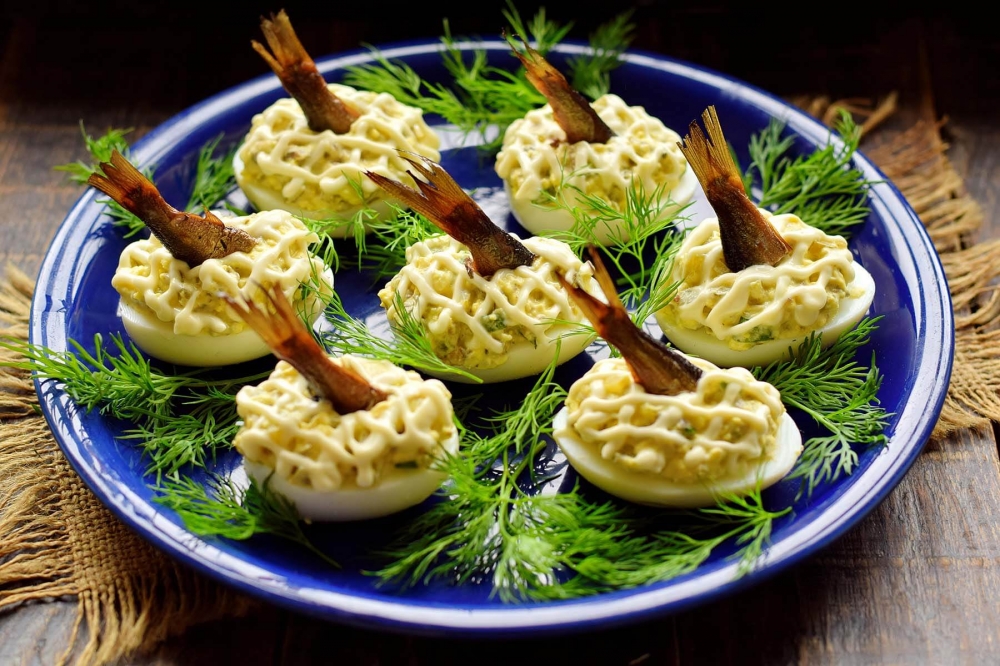 Такая закуска готовится очень быстро, а получается сытной и питательной. Она станет украшением любого праздничного стола. Торчащий из яйца хвостик шпрот выглядит привлекательно.