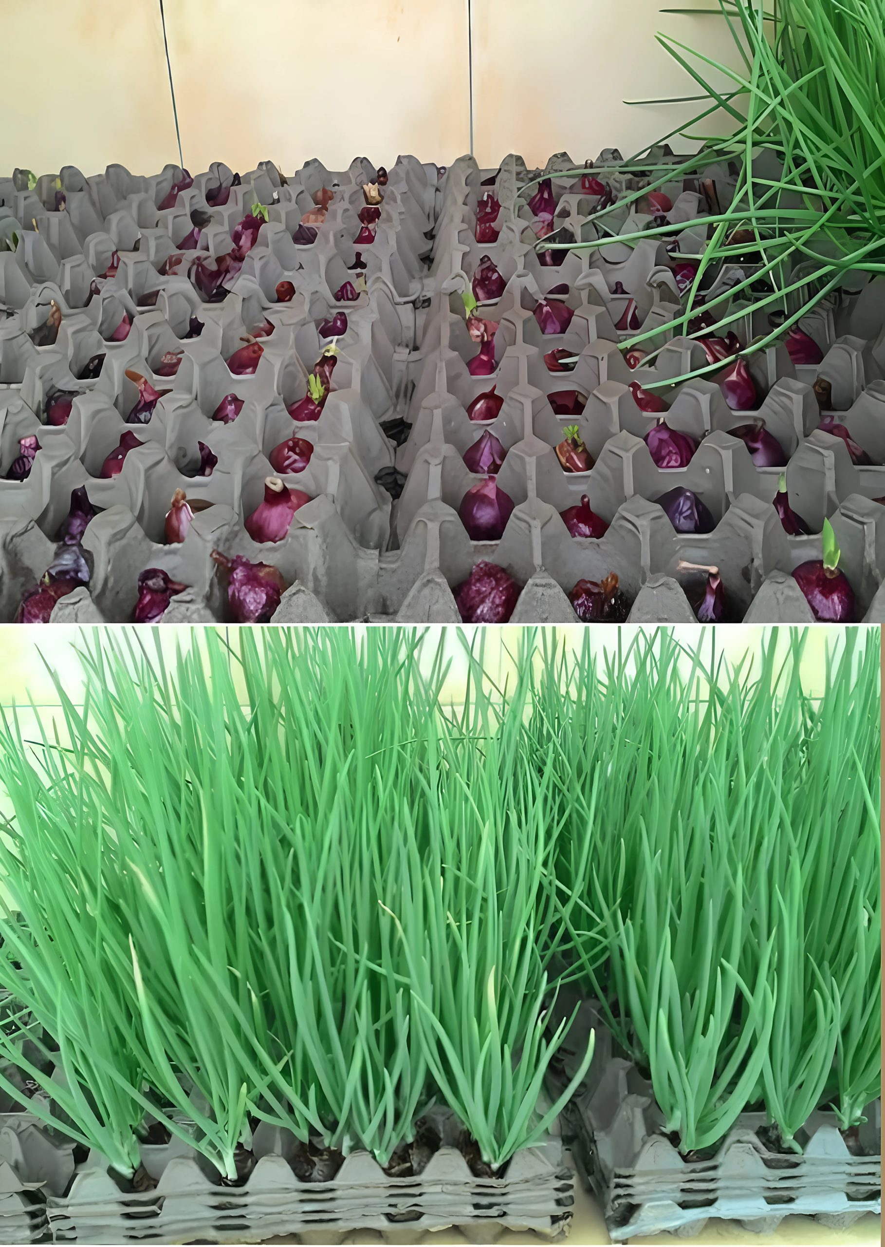 Нужно всего то три картонных поддона от яиц. Их следует сложить один на один. В углубления по наливать воды (немного) и воткнуть луковицы. Потом опрыскайте их водой из пульверизатора. Поливайте по мере высыхания картона. Больше ничего луку не нужно.