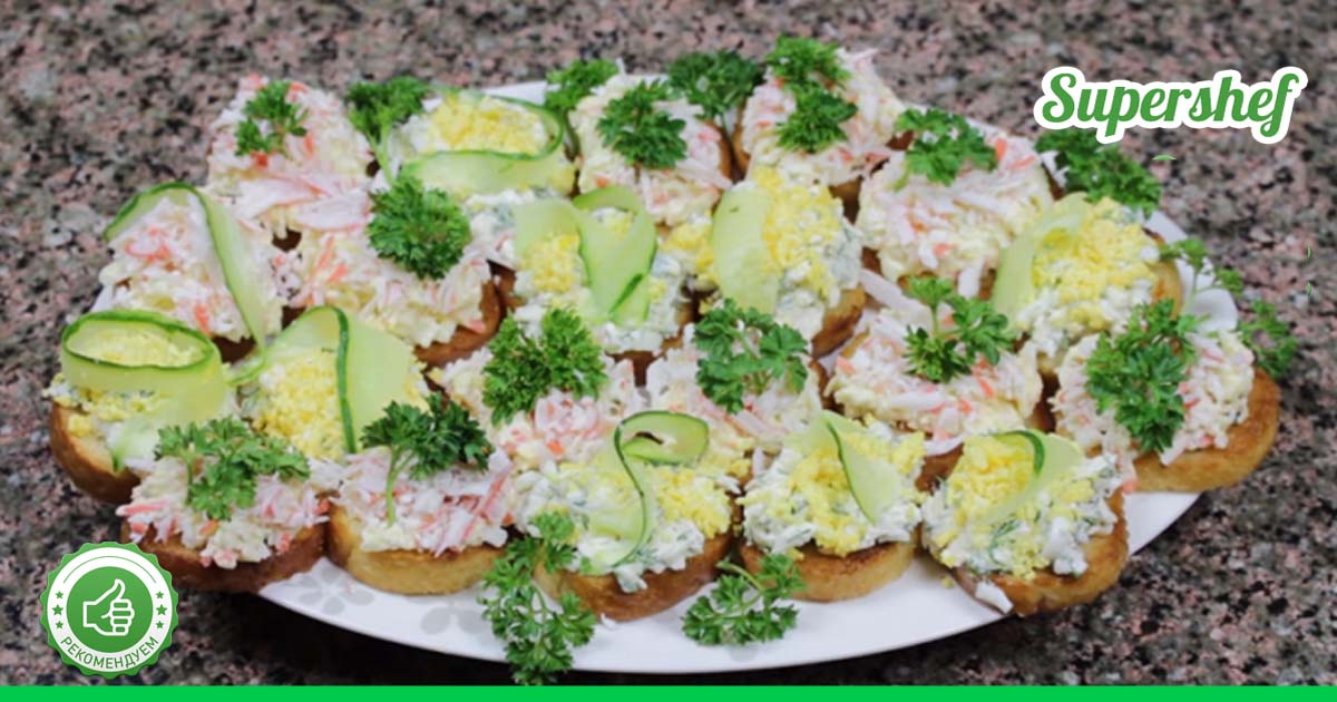 Одну часть поджаренных гренок мы намазываем первой начинкой из крабовых палочек и посыпаем также для украшения тертыми крабовыми палочками. Затем наши гренки можно украсить веточкой петрушки или любой другой зеленью.