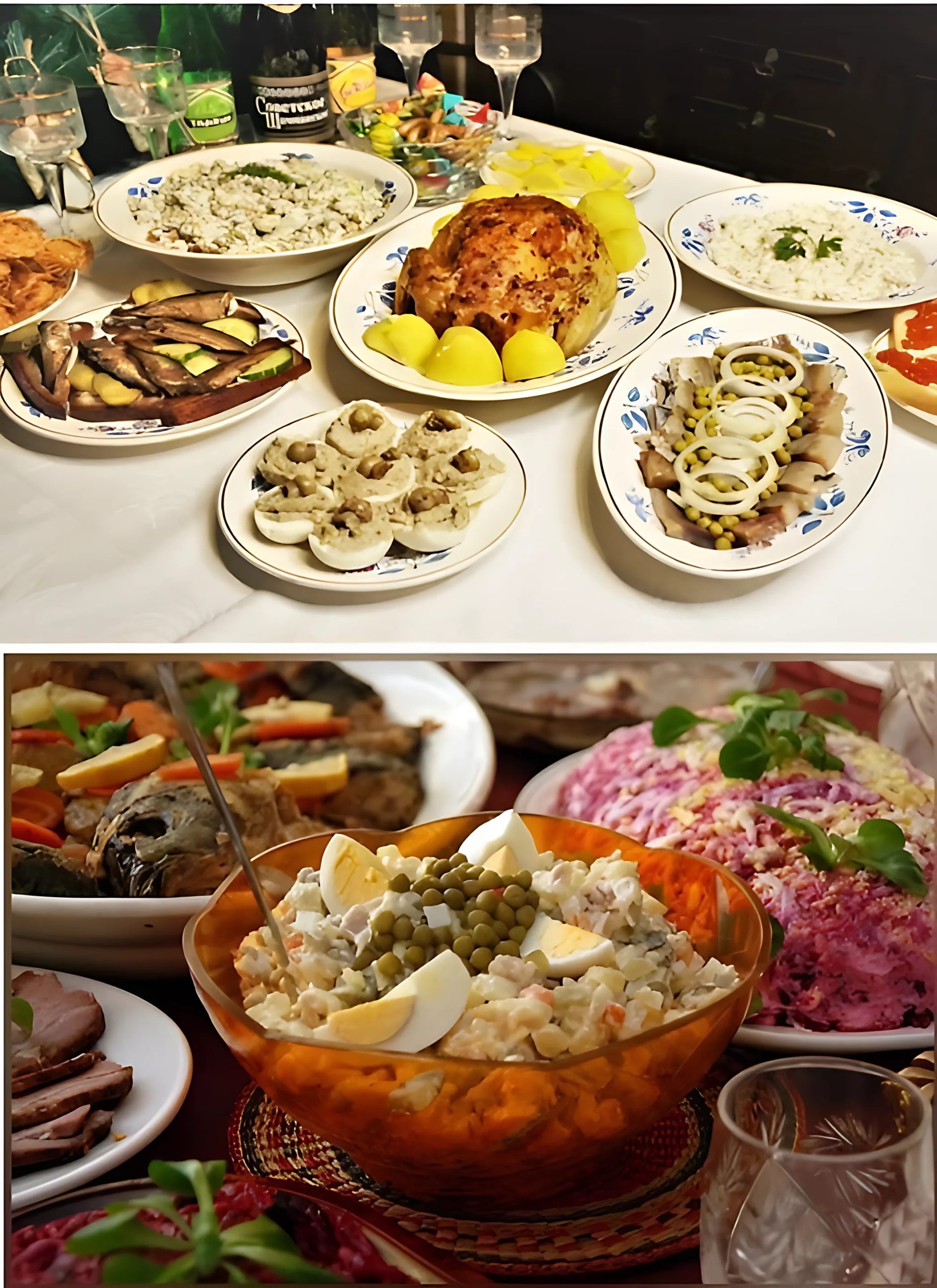 Дополнялось все салатами: “Оливье”, “Шуба”, “Мимоза”. Коронным блюдом был холодец или студень. В результате получался вполне сытный и разнообразный стол. Так что сложно сказать, что он был бедным и чего-то не хватало. Все могли наесться досыта.