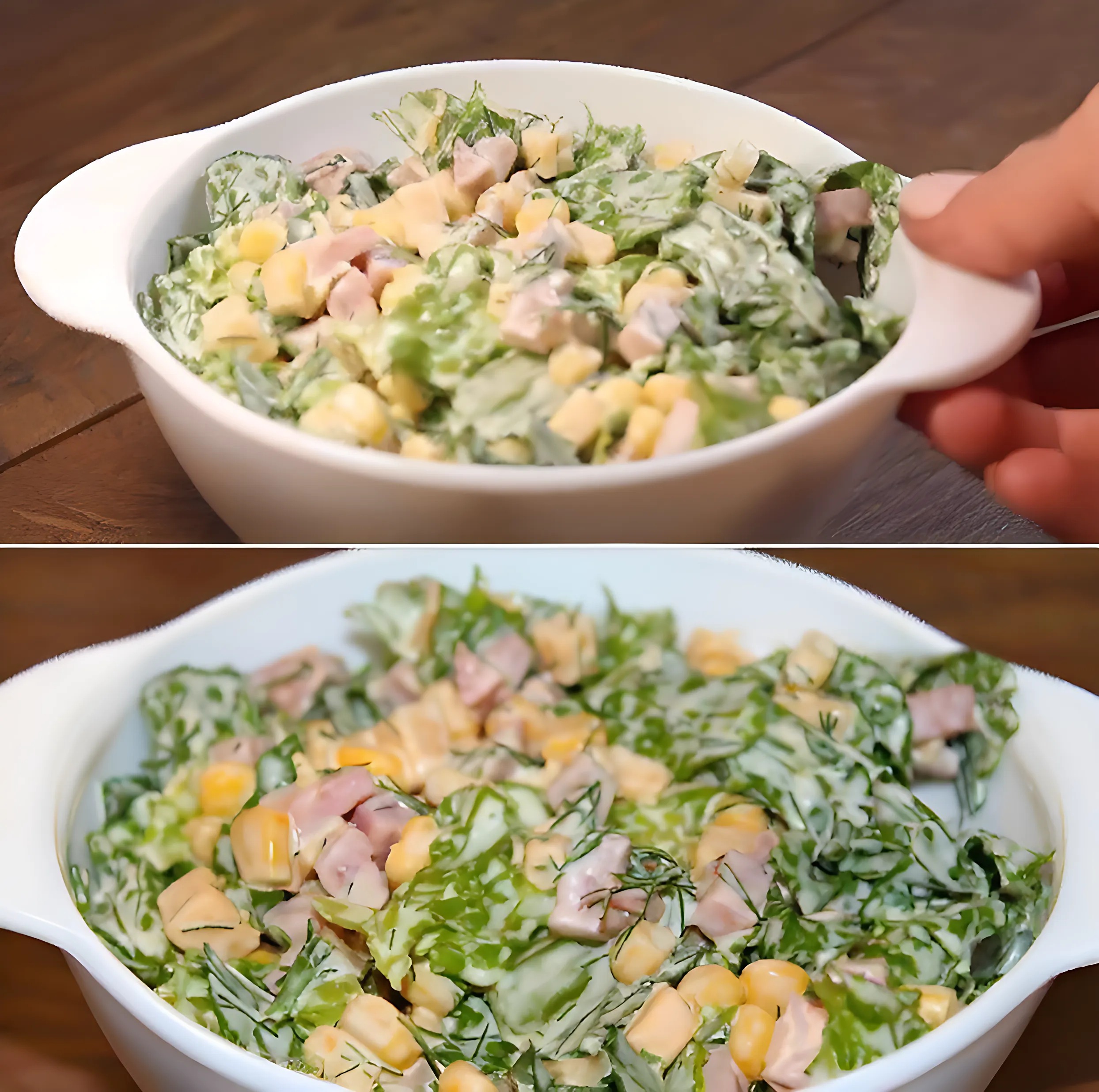 Готовится блюдо из салата, консервированной кукурузы и сыра. Оно точно всем понравится. Получается легкое, но сытное блюдо.
