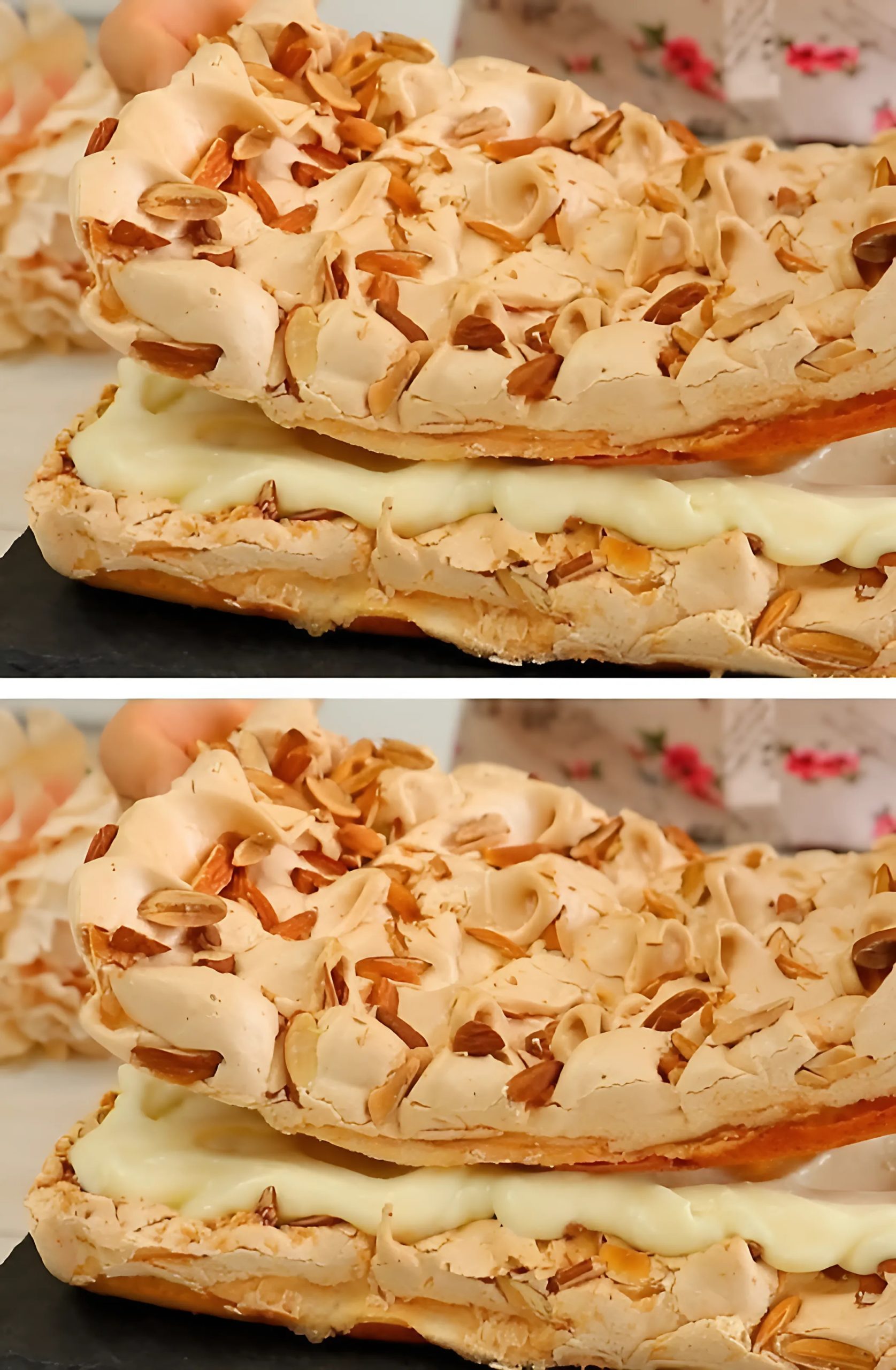 Приступаем к выпечке. Противень нужно застелить пергаментом. По нему распределить все тесто. Поверх выложить безе. Для украшения можно использовать дробленые орехи. Прогрейте духовку до 170 градусов и выпекайте десерт в течение 35-40 минут до золотистого цвета коржа.