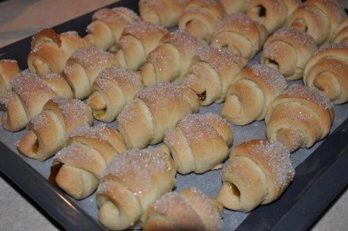 Духовку стоит заранее прогреть до ста девяноста градусов. Выпекаются рогалики примерно двадцать минут, пока не появится мягкий золотистый оттенок. Снимать их с противня лучше после того, как они немного остынут. При желании их обильно посыпают сахарной пудрой.