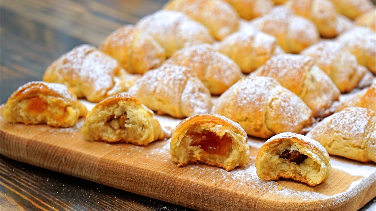 Начинка может быть любой – по вкусу. Можно оставить рогалики пустыми и потом просто посыпать сахарной пудрой. Если хочется добавить вкус, подойдут повидло, джем, сладкая паста, ореховые смеси, мак. Для любителей несладкой выпечки доступны варианты с сыром, ветчиной или рубленой зеленью.