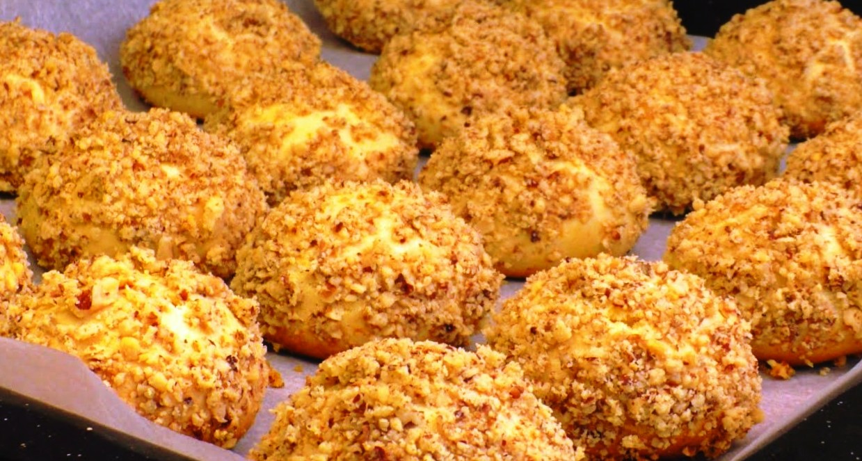 Полежавшее тесто нужно порезать на кусочки весом по 40 грамм. Кусочки скатываем в шарики, сплюскиваем или делаем другую форму. Промазываем яичным белком и обваливаем в дробленых орехах.