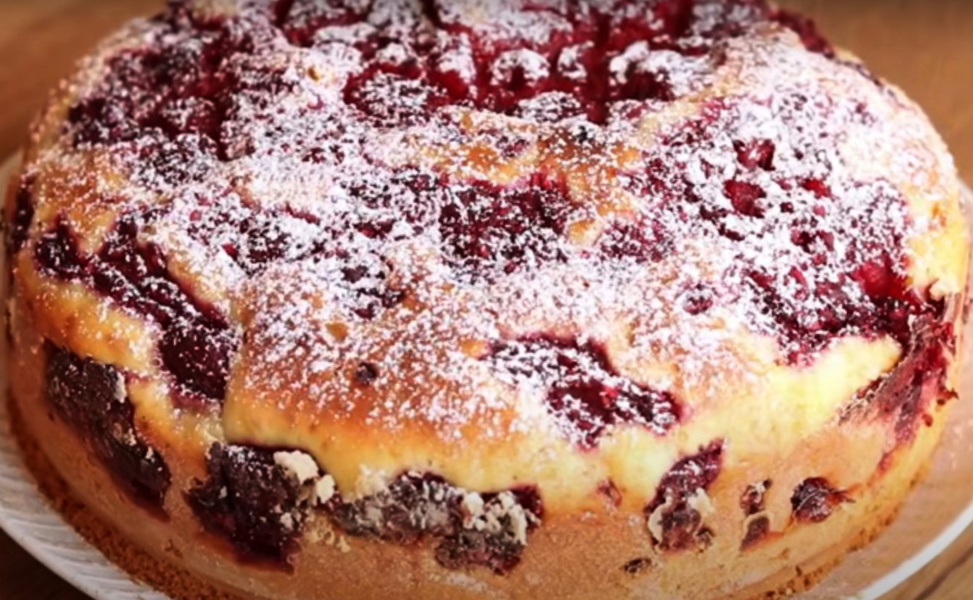 Добавьте остатки муки и тщательно вымесите массу. Переложите ее в форму, предварительно застелив ее пергаментом. Сверху выложите ягоды. Поставьте в разогретую до 180 градусов духовку на 40-50 минут. Наслаждайтесь ароматной выпечкой с чаем, кофе или молоком.