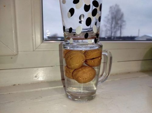 Для начала возьмите подходящую емкость, куда можно сложить орехи. Засыпьте орехи в эту емкость и залейте водой. После этого закройте емкость крышкой, чтобы орехи полностью погрузились в жидкость, и оставьте на 1 час.