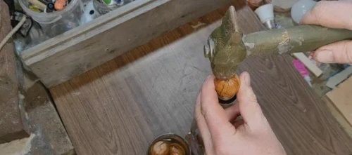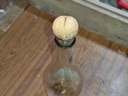 Затем вам понадобится бутылка с крепким горлом, например, от шампанского. Положите орех вертикально на горлышко бутылки так, как это показано на фотографии. Держите орех одной рукой, а другой аккуратно постучите молотком по верхней части скорлупы, чтобы она треснула.