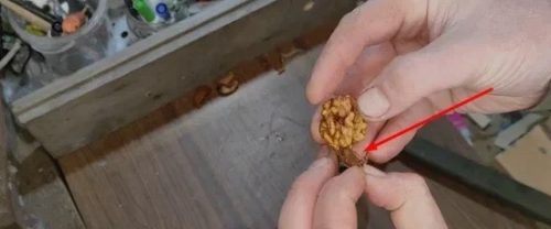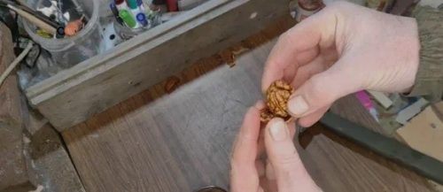 Как только скорлупа расколется, аккуратно удалите ее. Благодаря тому, что орех был в воде, он останется целым, не крошится. Последний шаг — аккуратно извлеките перегородки из ореха. В результате вы получите красивый целый орех, который не разрушится при чистке.