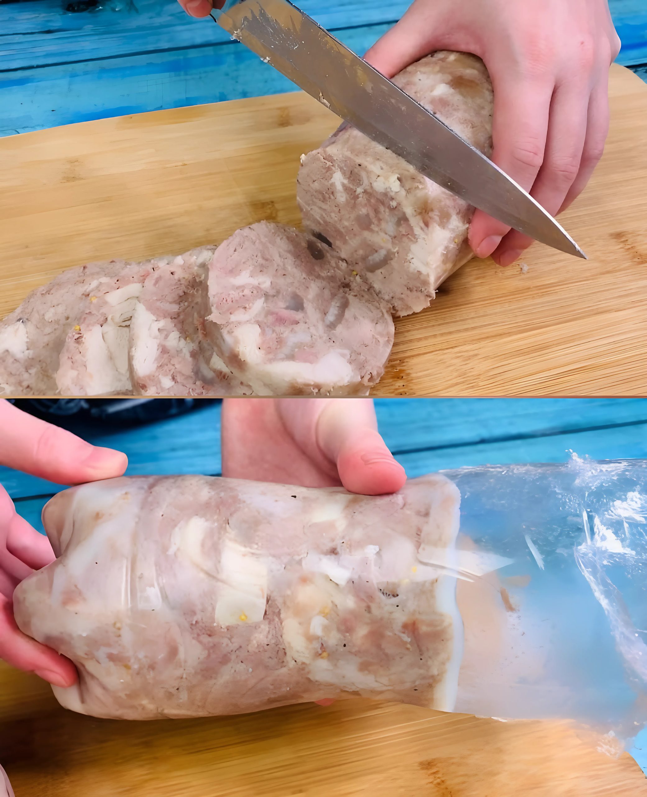 Приготовленная по этому рецепту мясная закуска с легкостью заменит магазинную колбасу. У нее настоящий