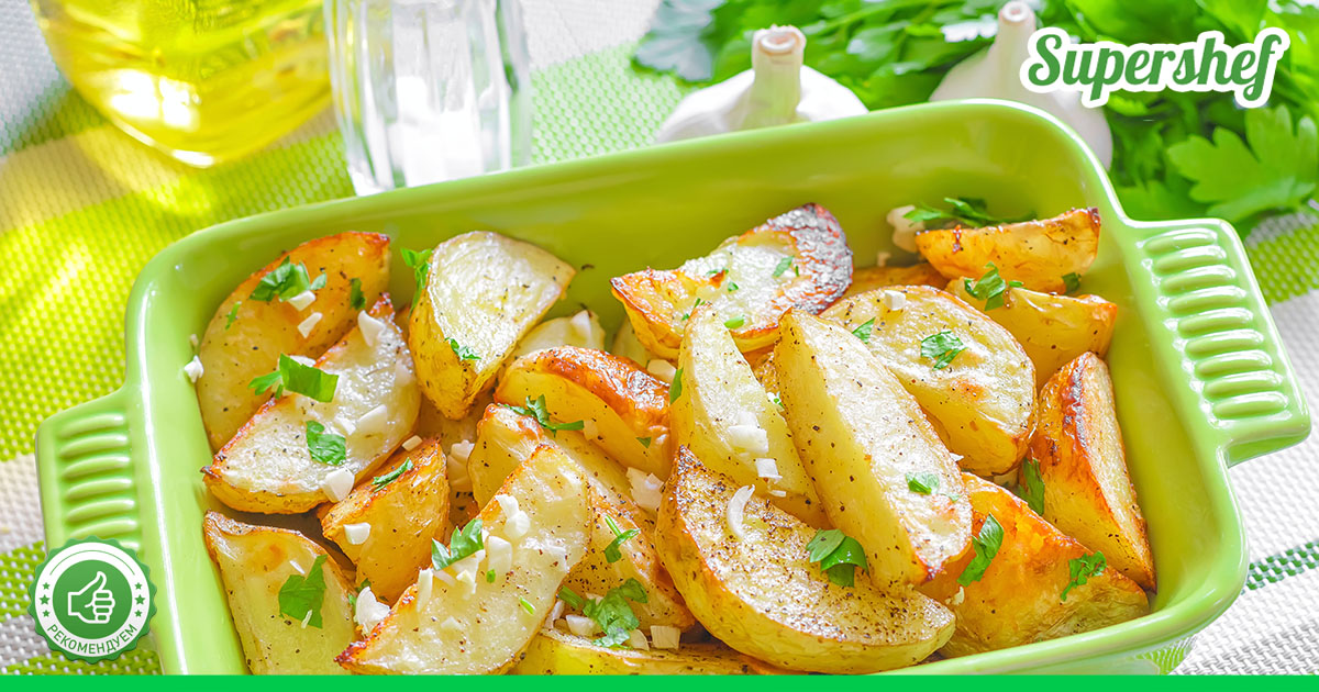 Это простейший рецепт того, как запечь картошку. Готовится она в духовом шкафу с добавлением чеснока.