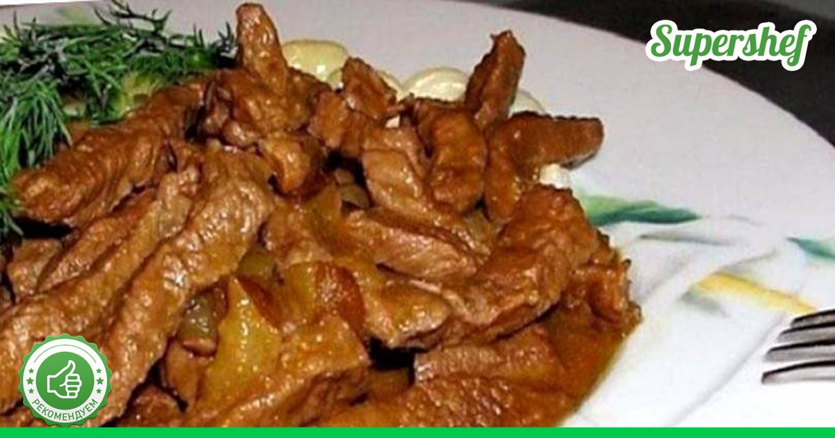 Продукты: Говядина (0, 5 кг) Грибы (0, 2 кг) Сметана (2 ст. л.) Лук (2 шт.) Мука (1 ст. л.) Горчица (1 ст.