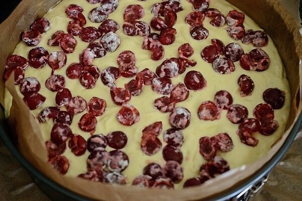 Застелите дно формы (рекомендуемый диаметр — 26 см) пергаментом. Перелейте тесто и разровняйте его. Сверху равномерно распределите подготовленную вишню. Отправляйте в разогретую до 160°C духовку (режим конвекции) примерно на 30–35 минут. Ориентируйтесь на золотистый цвет и сухую деревянную шпажку.