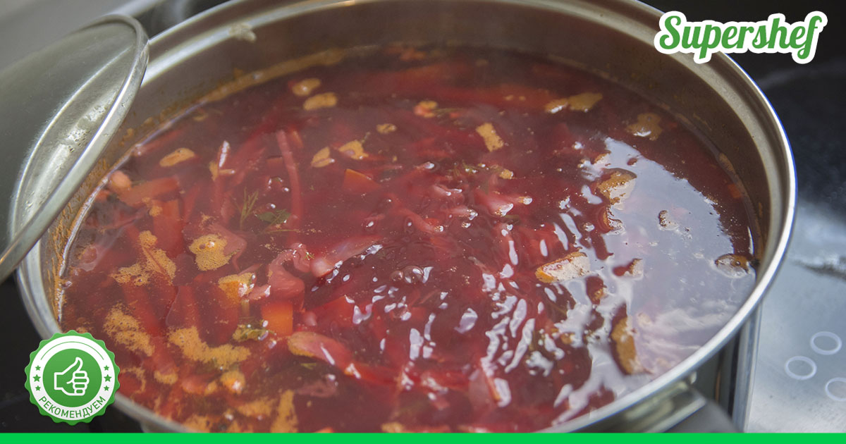 Пусть борщ хорошенько закипит. Когда останется 20 минут до конца приготовления, добавьте головку чеснока.