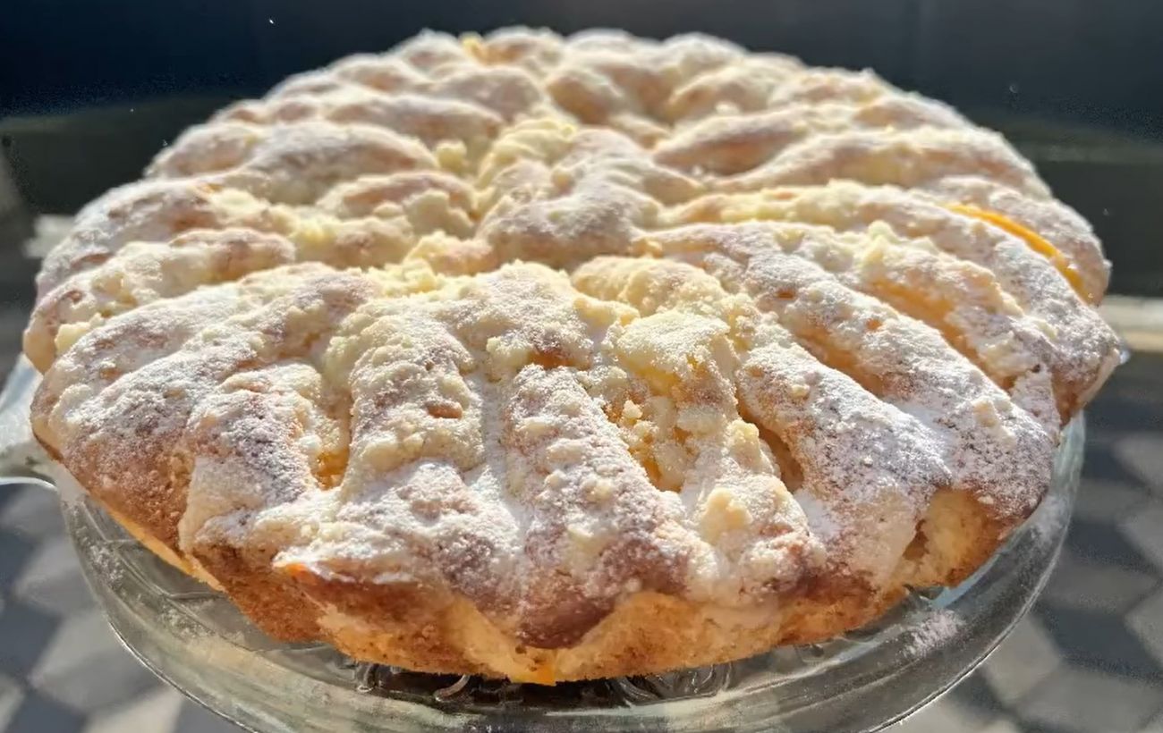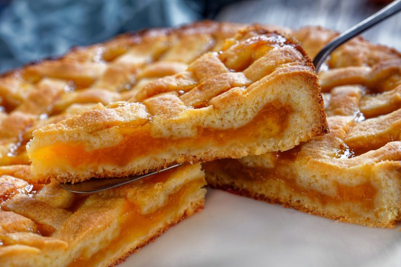 Смажьте форму и выложите большую часть теста. Оно должно покрыть низ и стороны формы. Вылейте сверху крем, выложите абрикосы и закройте второй половиной теста. После этого отправьте в духовку на 45 минут.