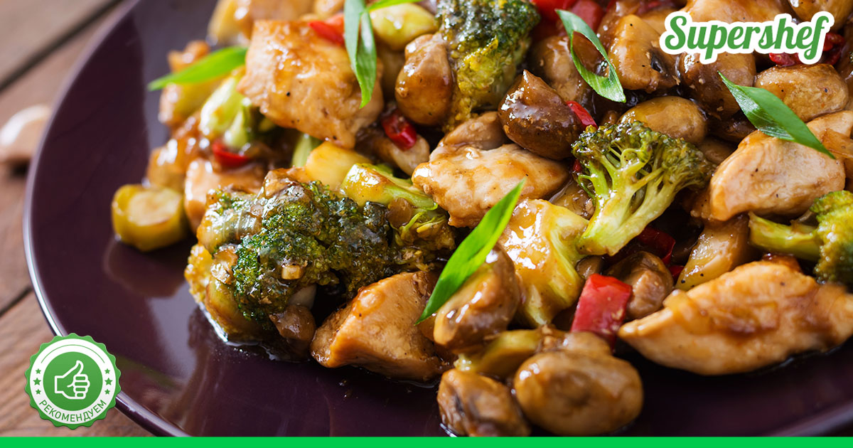 Теперь в сковороде обжаривается чеснок (2-3 зубочка) вместе с имбирем (столовая ложка), тростниковым сахаром (столовая ложка), кунжутным маслом (столовая ложка), соевым соусом (50 граммов). Все это после пяти минут обжарки заливается стаканом куриного бульона. Через десять минут на сковороду выгружаются из тарелок курица и грибы с брокколи. Вся масса тушится пять минут с постоянным перемешиванием на сковороде.