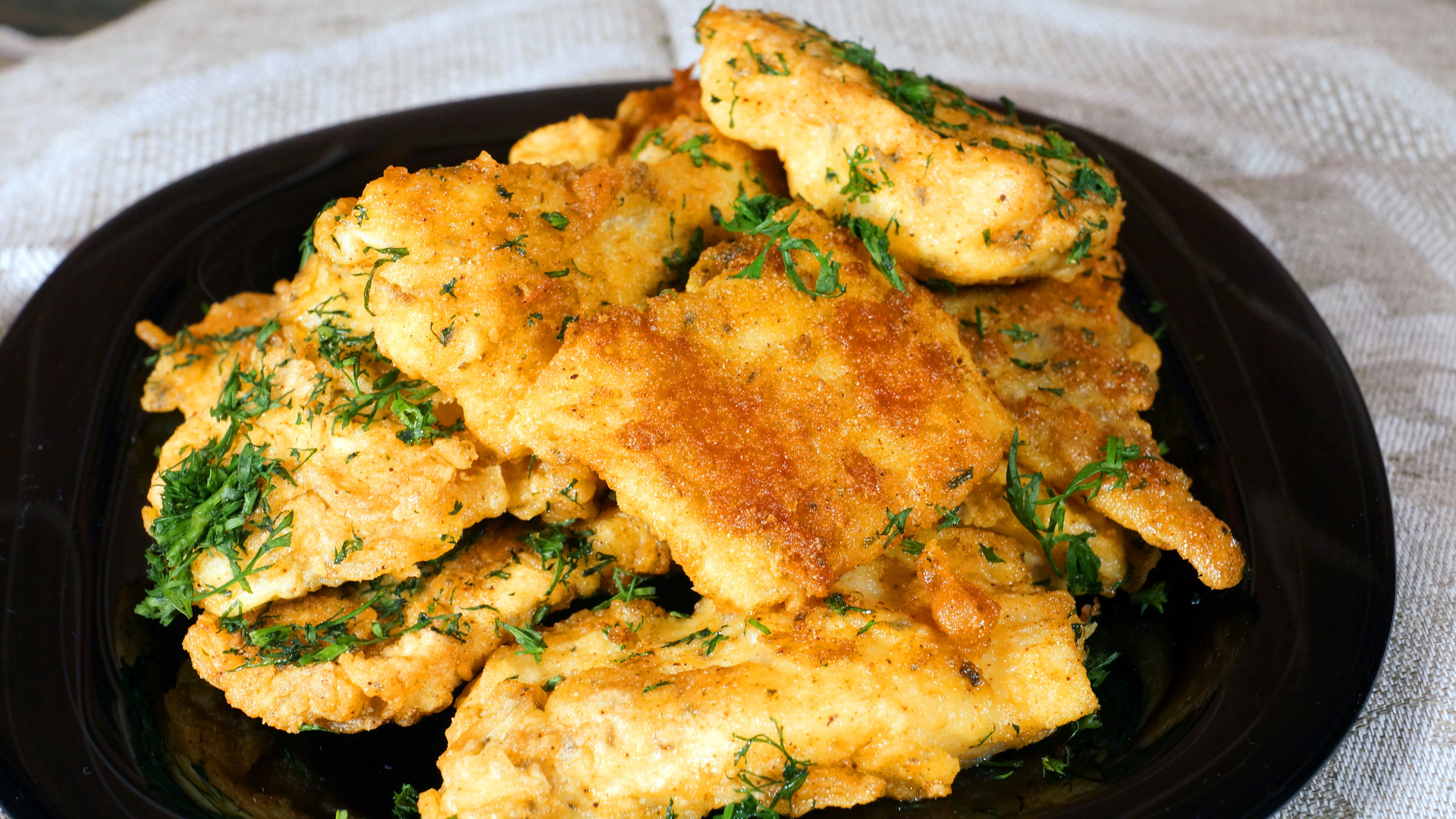 Каждый кусочек нужно обжаривать с двух сторон до золотистого цвета.