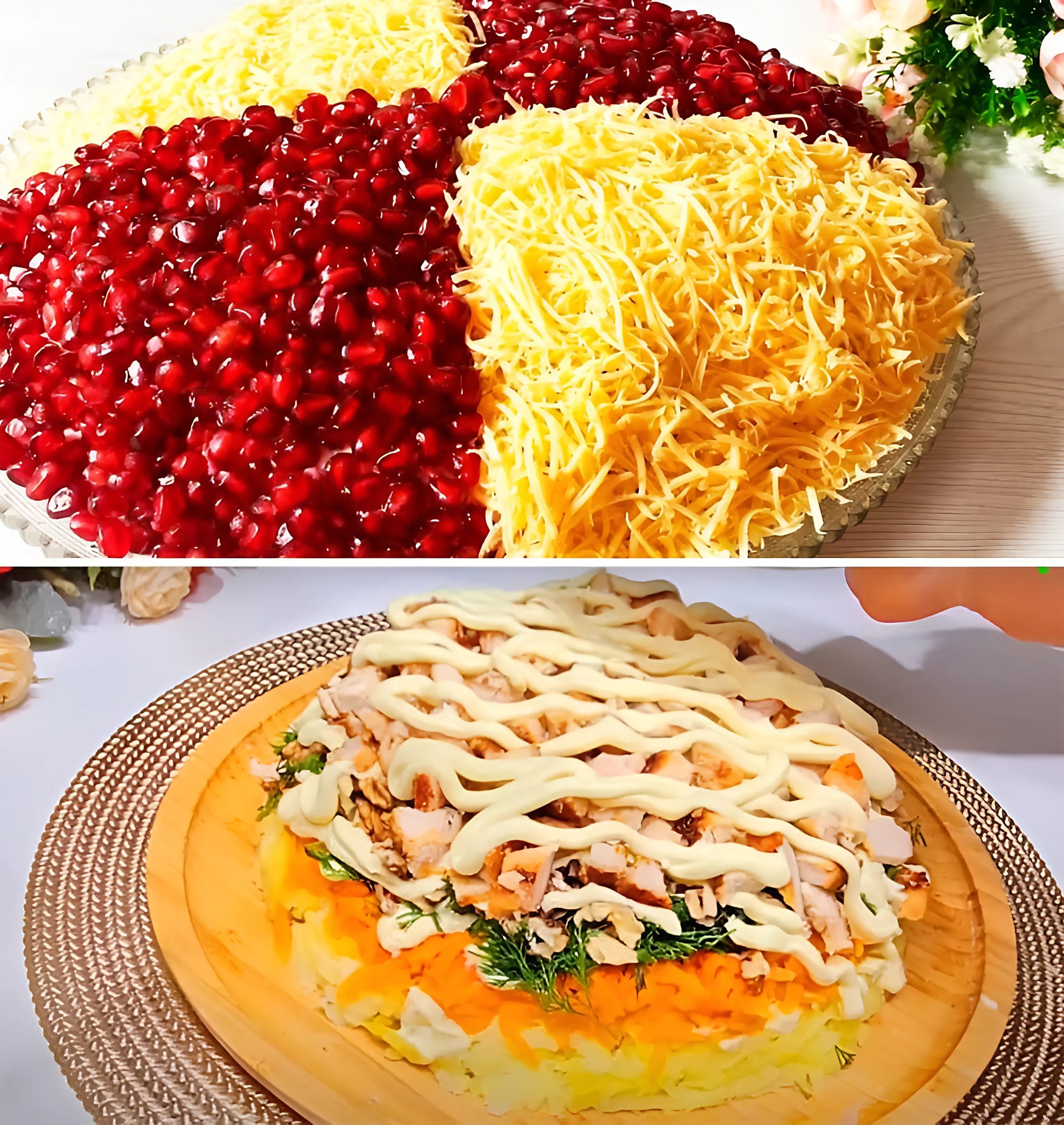 Остывшую курицу порезать кубиками, выложить на зелень и заправить майонезом. Последний штрих – яйца. Полить майонезом, посыпать со всех сторон тертым сыром. Украсить гранатом.