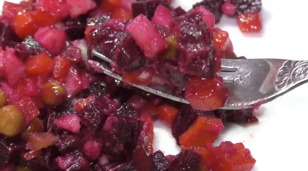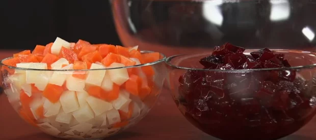 Свеклу отваривают до мягкости, картофель и морковь готовят отдельно. После остывания овощи очищают и нарезают аккуратными кубиками. Чтобы свекла не «раскрасила» остальные ингредиенты, ее кусочки заранее слегка сбрызгивают маслом.
