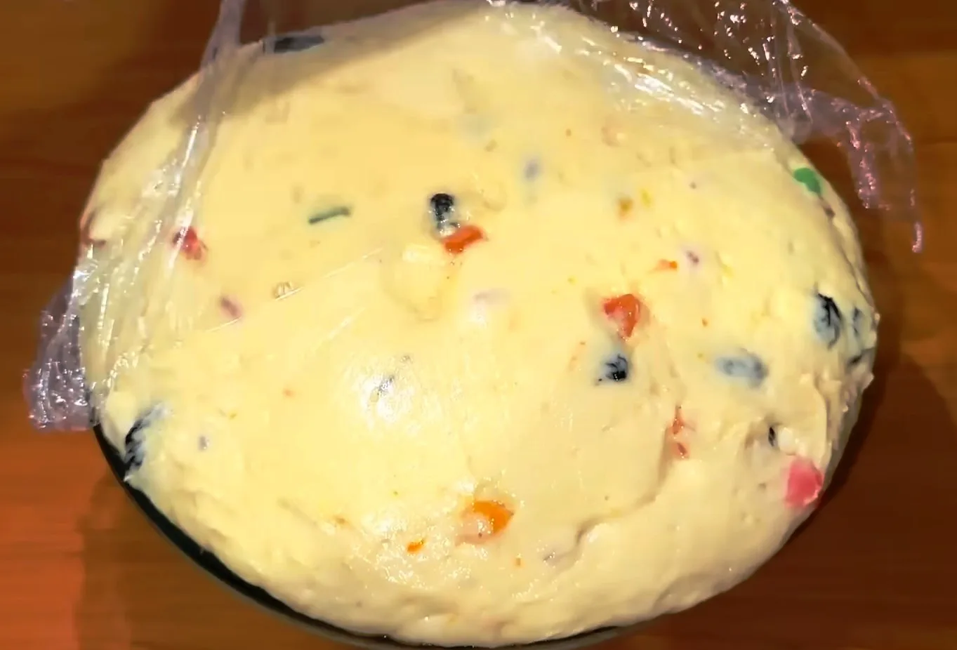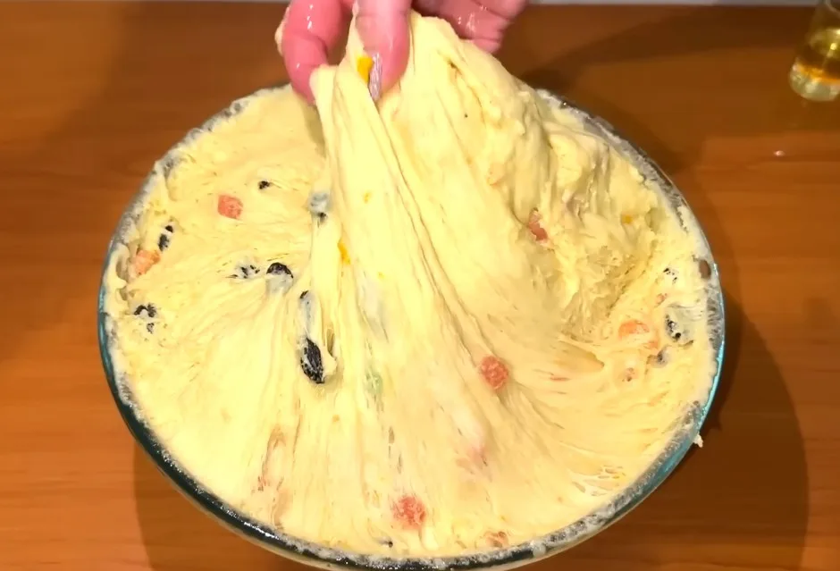 - Вмешайте в тесто обсушенные цукаты. Накройте пленкой и дайте подняться в теплом месте (1–1,5 часа).