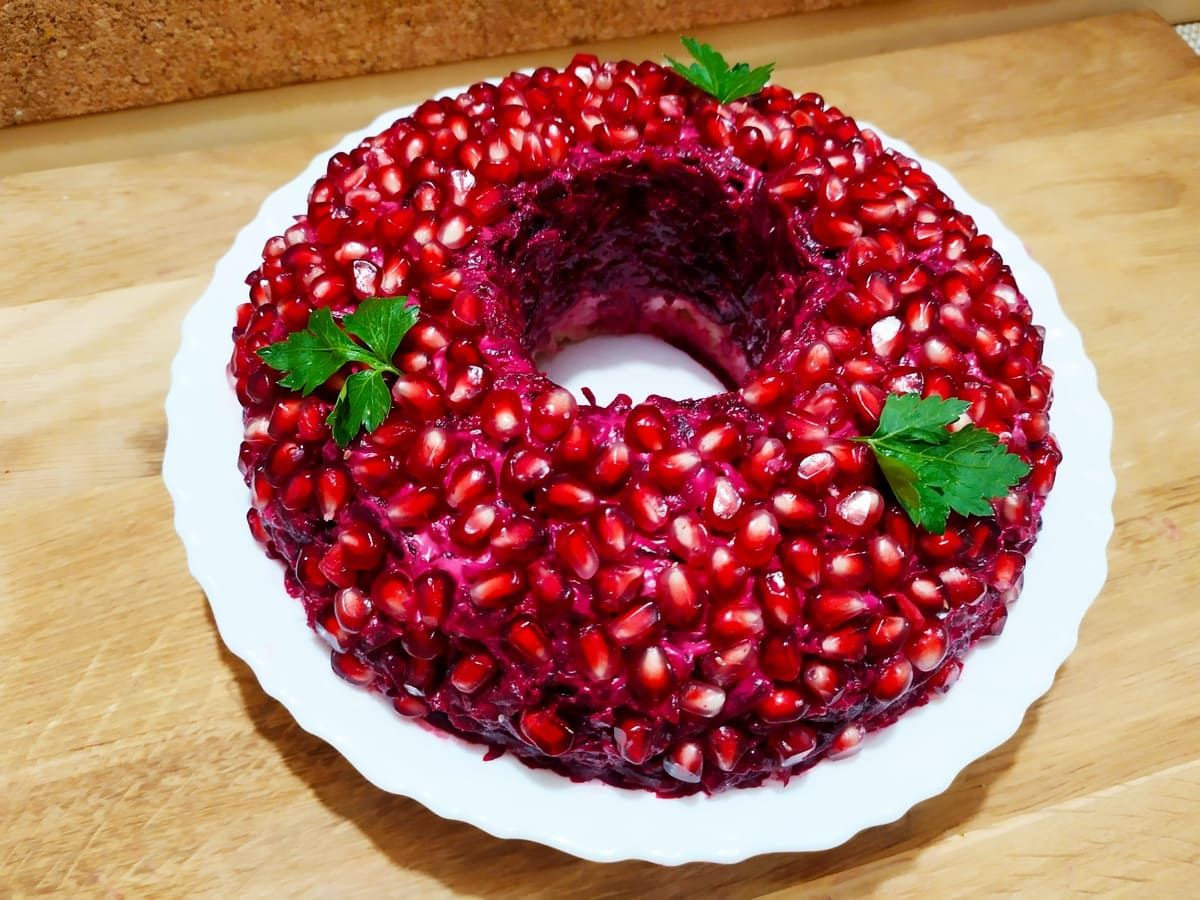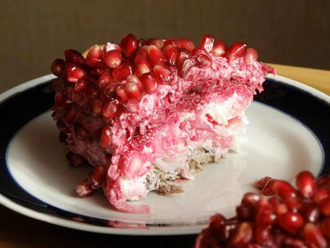 - После сборки салат убирают в холодильник минимум на 3 часа, а затем аккуратно снимают кольцо. Такой салат не только вкусный, но и яркий, с интересной кислинкой от граната.