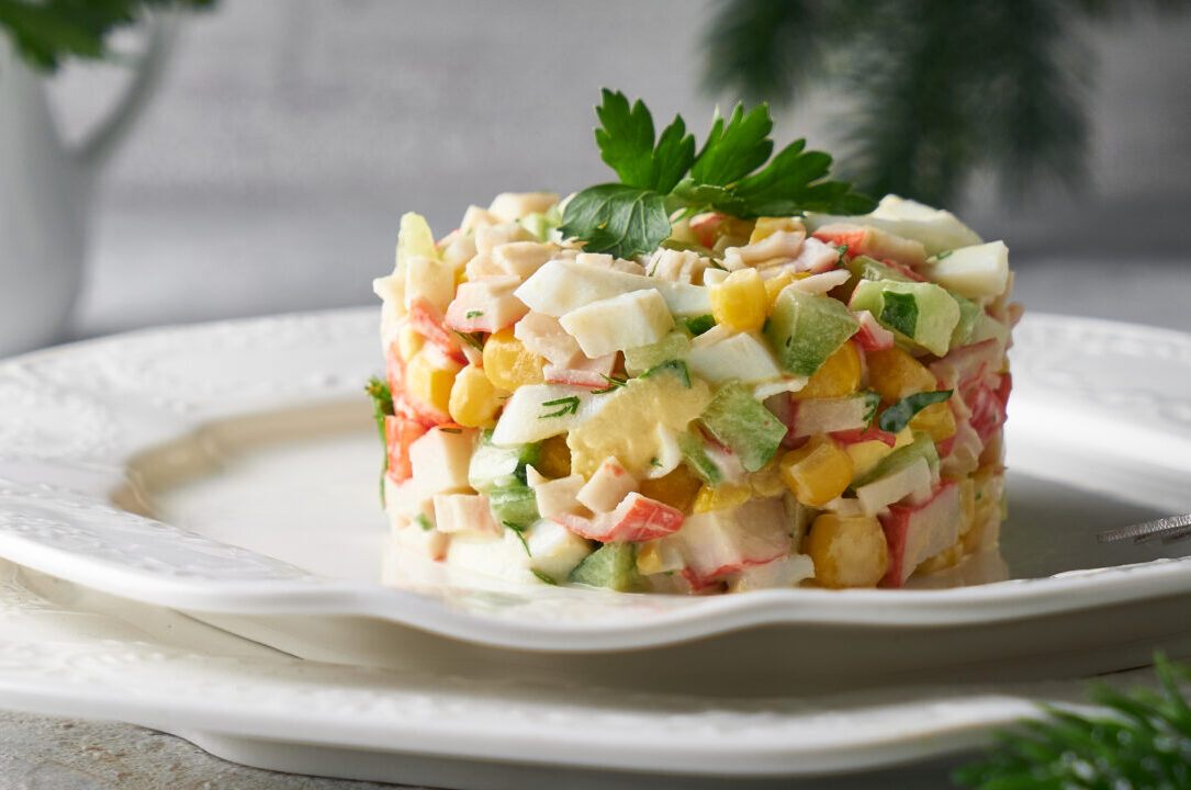 Крабовый салат — неизменный фаворит многих праздничных застолий. Предлагаем вашему вниманию весеннюю версию этого популярного блюда, которая освежает привычные вкусовые сочетания.