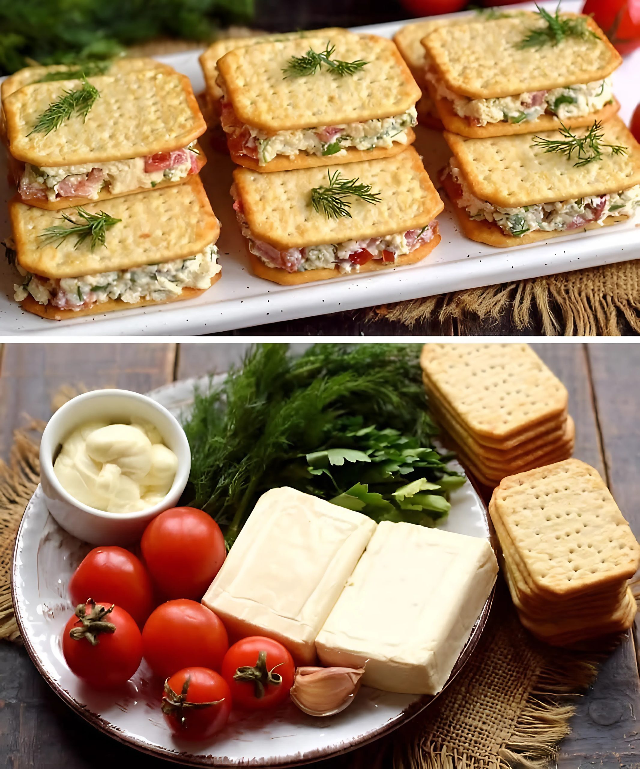 Закуску лучше подавать сразу на стол, чтобы крекер не стал мягким. Как видите, невероятно вкусно и просто!