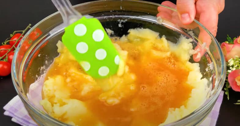 Картофель следует очистить, нарезать крупными кусочками и сварить до мягкости в слегка подсоленной воде. Потом его превращают в пюре удобным способом. Отдельно вилкой взбивают яйца с добавлением соли и перца, заливают эту смесь в картофельную массу и тщательно перемешивают.