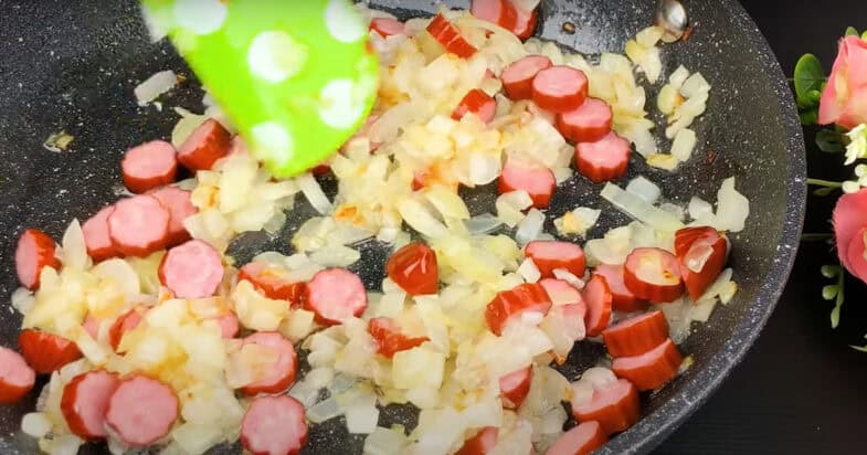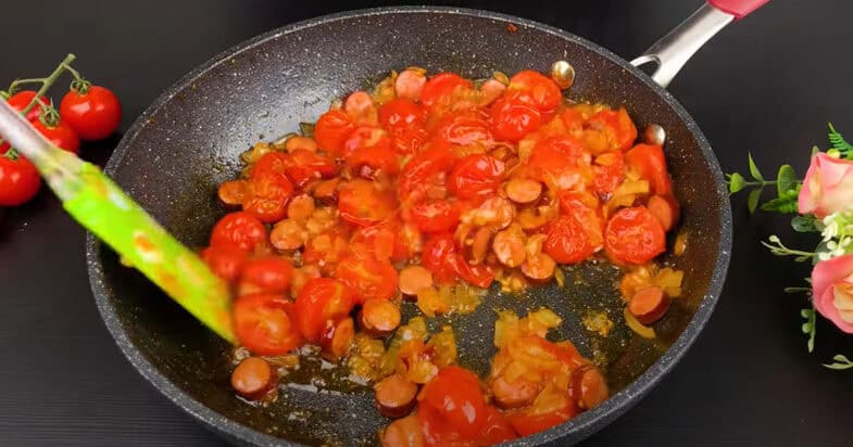 Для зажарки на разогретом масле сначала подрумянить мелко порубленный лук. После появления золотистого оттенка добавляют нарезанные кружочками охотничьи колбаски и держат на огне еще несколько минут. Помидоры черри разрезают надвое и отправляют к остальным ингредиентам. Чеснок натирают на мелкой терке и тоже вмешивают в смесь, добиваясь яркого и насыщенного аромата.