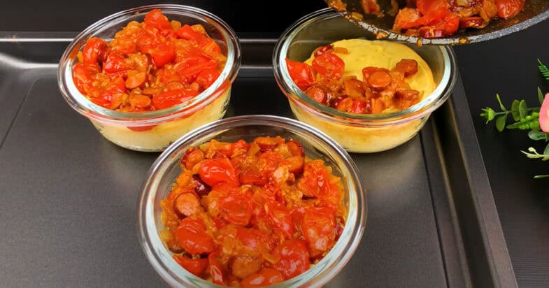 Форму для запекания смазывают растительным маслом и выкладывают на дно картофельную массу, разравнивая ее. Сверху помещают горячую зажарку с колбасками и помидорами. Завершающим слоем станет сыр, натертый на средней терке.