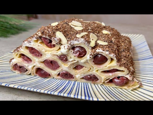 На край каждого блинчика выложи полоску вишни и сверни его в рулет.
