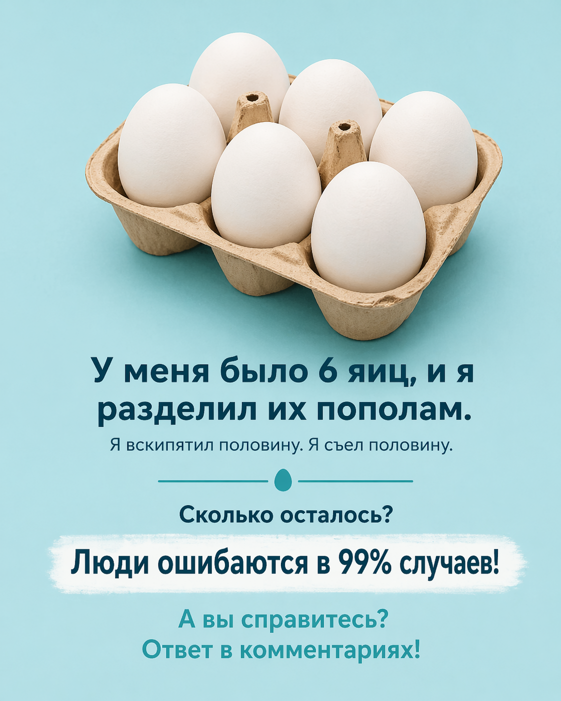 «У меня есть 6 яиц. Два я разбил, два поджарил и два съел. Сколько яиц осталось? 99% людей отвечают неправильно».