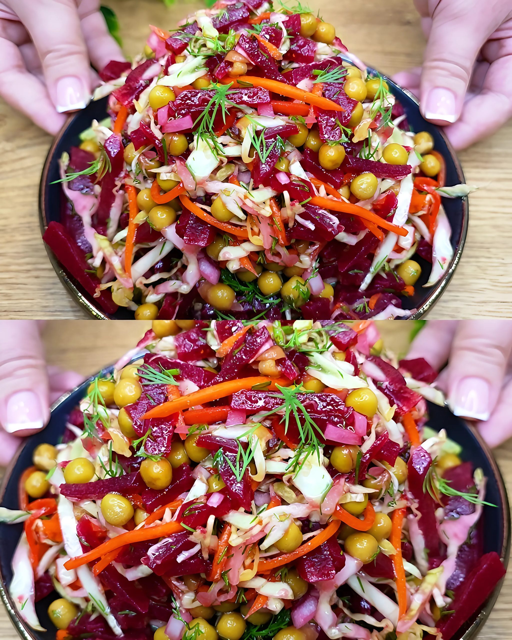 Капусту нужно нашинковать мелко и немного отожмите руками. Сварите свеклу, очистите и нарежьте брусочками тонко. В салатник сложите капусту, морковь, горошек, свеклу.